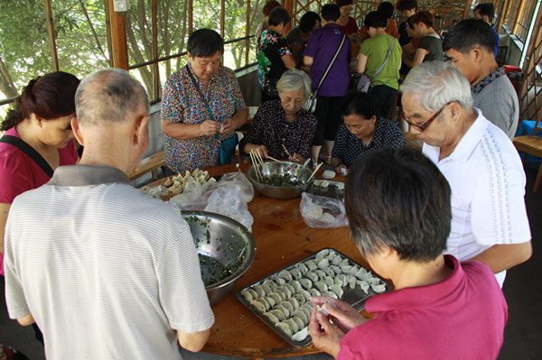 此次活動共有120多名體協(xié)會員參加,大家都想借此機會和大自然來個親密接觸,體協(xié)委員利用休息時間為大家采購了豐富美味的食物。利用新世紀綠草地依山伴水的地理資源優(yōu)勢,在秋日和煦的陽光下,在風景秀麗的南明湖邊,我們老年人在綠草地上展現(xiàn)了 “年輕人”舞步,跳著佳木斯健身操動作,擺動雙臂,邁開雙腳,走出健康,走出幸福。當走進餐廳看見桌子上擺好的餃子皮和餃子餡,老同志們便紛紛摩拳擦掌,躍躍欲試。他們各自分工后便熱火朝天的忙起來,現(xiàn)場笑聲不斷。