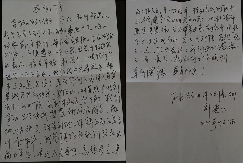 盡快送回“救命錢”,對金偉平來說,是做好本職工作,但對鄒女士母女來說,卻也猶如雪中送炭,正如鄒女士在信中寫道,“作為我們麗水的窗口單位(客運西站),有這樣負責任,急旅客之急的工作人員,是一件好事,特別是我們麗水正在創(chuàng)建全國文明城市的關口,這種精神更值得表揚。”