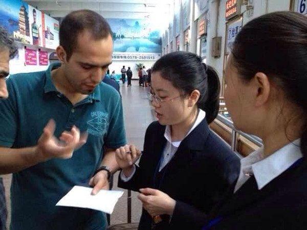 兩名外國(guó)旅客因?yàn)橛幸?,等不?:40的車(chē)。經(jīng)過(guò)葉菁的一再溝通,乘客在通完一通電話后表示自己的朋友愿意開(kāi)車(chē)送他們?nèi)チx烏,就不再乘車(chē)了。充當(dāng)“翻譯”的葉菁又向宣站長(zhǎng)轉(zhuǎn)達(dá)了他們的意思,站長(zhǎng)當(dāng)即給他們辦理了退票手續(xù),手里握著退回金額的兩名外國(guó)旅客連連道謝,念叨著:“Thank you! Thank you!"并對(duì)葉菁的熱心幫忙豎起了大拇指。